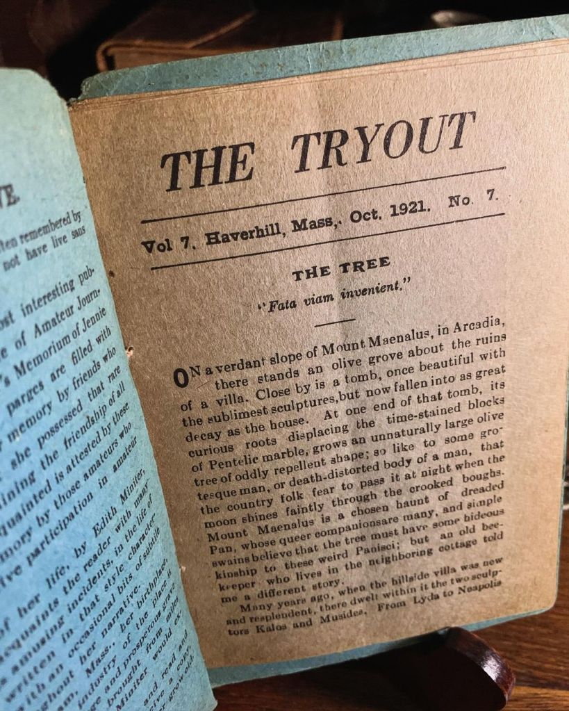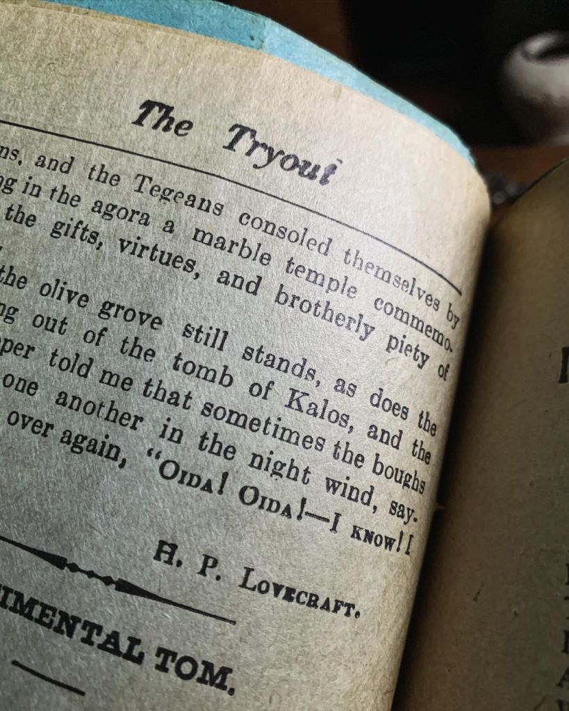 « Sur un des flancs verdoyants du Mont Ménale, en Arcadie, s’étend un bois d’oliviers autour des ruines d’une villa. Tout près de là se trouve une tombe qui fut un jour d’une grande beauté, ornée des sculptures les plus sublimes qui sont aujourd’hui aussi délabrées que la maison. À l’une des extrémités de la tombe, ses racines singulières délogeant les blocs de marbre pentélique marqués par le temps, croît un olivier d’une taille anormale, impressionnante et d’une forme curieusement repoussante, si proche de celle d’un homme à la silhouette grotesque ou bien d’un corps humain déformé par la mort que les habitants de la campagne environnante craignent à la nuit de s’en approcher lorsque la lune lance ses faibles lueurs à travers les branches difformes. Le Mont Ménale est un lieu de prédilection pour Pan, le redouté, dont les étranges compagnons sont multitude, et les amants à l’âme simple croient que cet arbre possède quelque lien hideux avec ces panisques inquiétants ; mais un vieil apiculteur vivant dans la petite maison voisine m’a conté une histoire bien différente. »