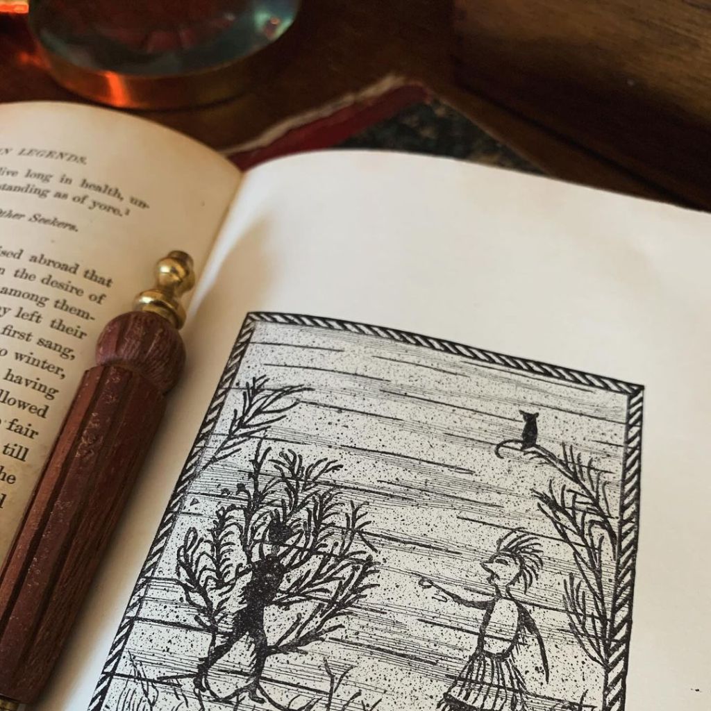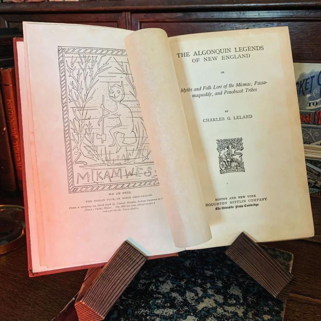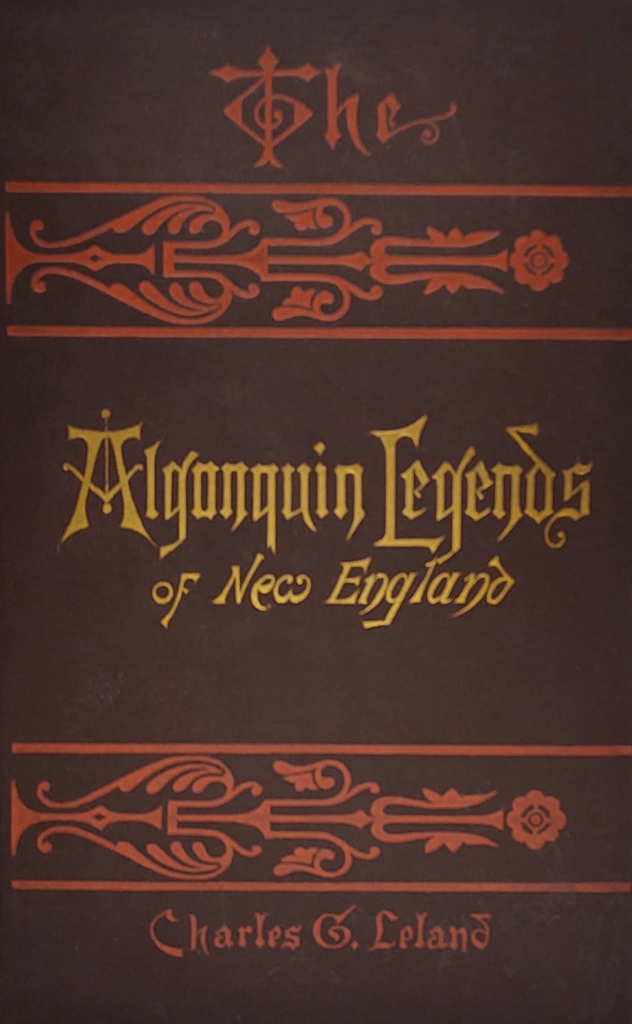 Première édition, datant de 1884, de l’ouvrage intitulé Les légendes algonquiennes de la Nouvelle-Angleterre de Charles Godfrey Leland sur le folklore des «principaux Indiens Wabanaki ou peuples algonquiens du nord-est». L’ensemble du contenu a été recueilli directement auprès de narrateurs amérindiens ; la grande majorité par Leland lui-même. Les illustrations de Tomah Josephs sont des reproductions de celles réalisées par les Algonquins sur l’écorce de bouleau.