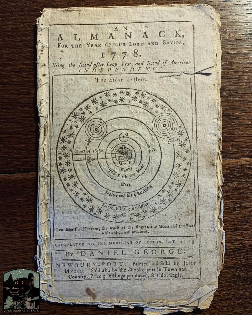 Almanach de 1778, imprimé à Newburyport. Il est orné d’une représentation du Système solaire et accompagné du psaume 8 verset 4 : « Quand je considère vos cieux, qui sont les ouvrages de vos doigts, la lune et les étoiles, que vous avez affermies. »