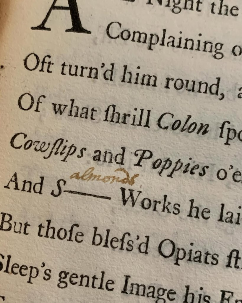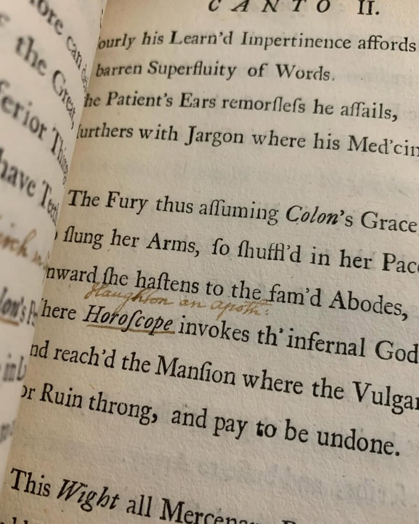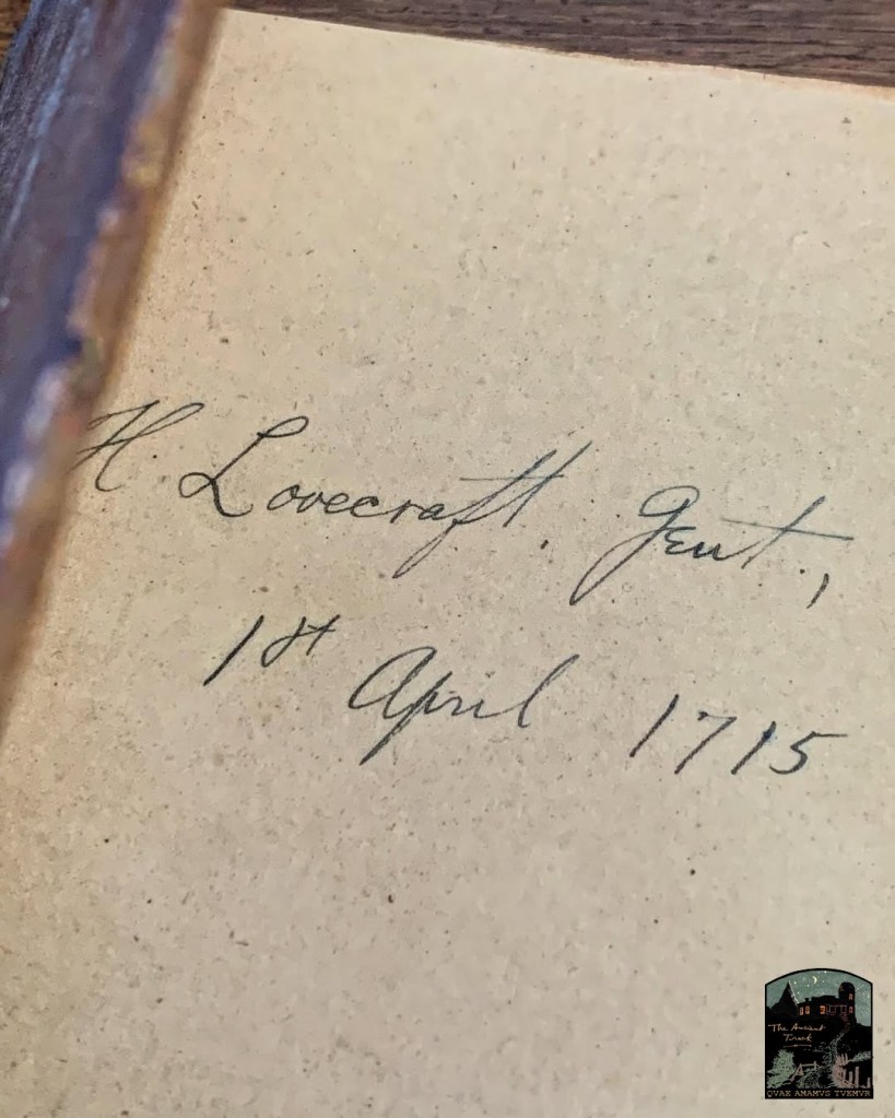 Lovecraft acquiert son exemplaire du Dispensary de Garth le 18 avril 1915. Il omet l’initiale P de Phillips lorsqu’il prétend vivre au XVIIIe siècle (il écrit 1715 au lieu de 1915), une époque où l’usage des initiales pour les prénoms était rare — je tiens à remercier S.T. Joshi de m’avoir orienté vers cette interprétation. Le livre comporte de nombreuses notes manuscrites, certaines d’entre elles semblent avoir été rédigées par le gentleman de Providence.