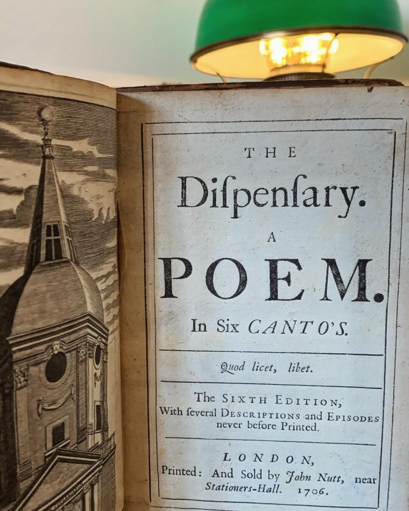 The Dispensary de Samuel Garth est une parodie satirique du traditionnel poème épique et constitue peut-être un des meilleurs exemples de poésie médicale. Garth s’intéressait autant à la littérature qu’à la médecine. Il composa plusieurs poèmes dédiés à divers membres de la noblesse anglaise et traduisit les Métamorphoses d’Ovide. Son œuvre la plus célèbre n’en demeure pas moins The Dispensary. Si elle est satirique par le ton, elle traite d’une des affaires médicales les plus débattues de la fin du XVIIe siècle à Londres : celle du dispensaire de Londres.